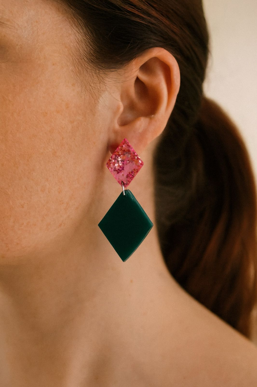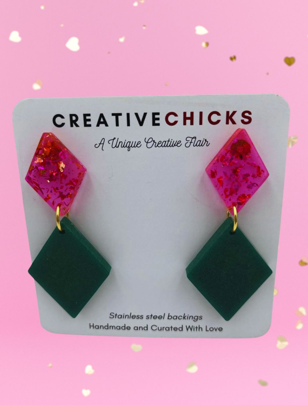 Resin Earrings Holiday Glam – Pink, Rose Gold Flakes & Dark Green